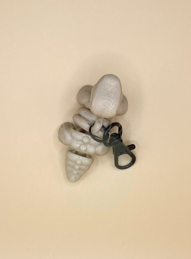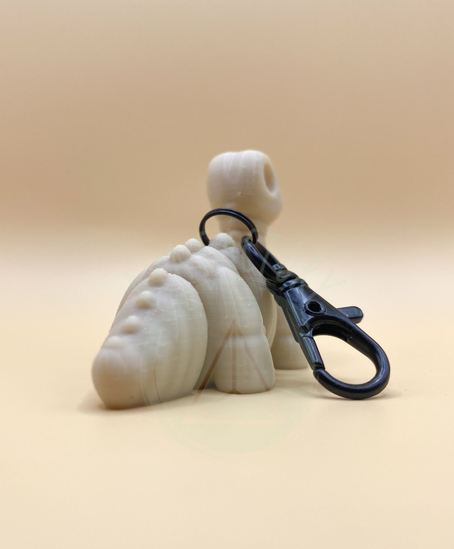 Ce modèle de porte-clés Brontosaure squelette articulé imprimé en 3D est fabriqué à partir de PLA (un matériau biodégradable, non toxique, principalement réalisé à base d’amidon de maïs).