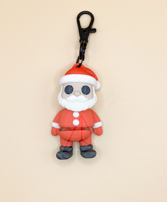 Ce modèle de porte-clés de Père Noël articulé imprimé en 3D est fabriqué à partir de PLA (un matériau biodégradable, non toxique, principalement réalisé à base d’amidon de maïs).